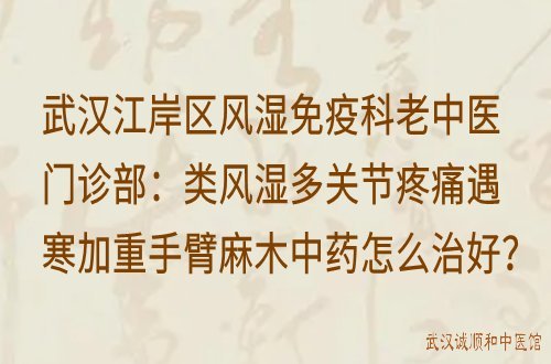 武汉江岸区风湿免疫科老中医门诊部:类风湿多关节疼痛遇寒加重手臂麻木中药怎么治好?类风湿多关节疼痛属于中医的痹症的范畴,初起多无明显诱因出现伴晨僵,不少人经西药治疗后症状仍反复,甚者全身多关节疼痛。遇寒痛剧,恶风,双上肢麻木,身困,入睡困难,舌质淡苔薄白,脉沉。中医认为平素起居不慎,外感风寒湿邪,流注于关节、经脉之间,伤及血脉,浸淫筋骨,影响气血周流,营卫行涩,气血不通,不通则痛,故遍身关节疼痛。日久表邪入里痼结,阳气受损,卫外不固,腠理空虚,阴寒内盛,故时有恶风、疼痛表现为遇寒加重。病久脏腑气损,气虚则血行无力,络脉瘀阻,故见肢体麻木。气虚络瘀,肢体失荣,故见身困。疼痛剧烈,影响睡眠,故见寐差。