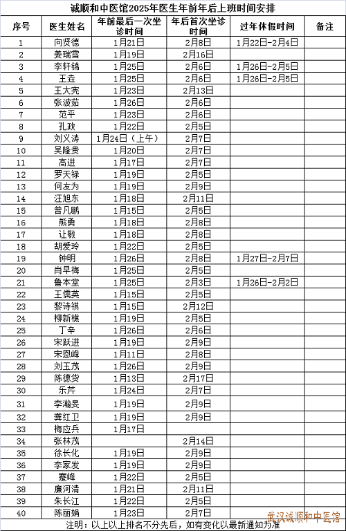 武汉诚顺和中医门诊部(诚顺和中医馆)春节前后专家具体坐诊时间如下表: